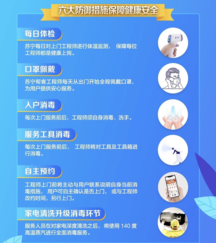 據(jù)了解,該承諾卡是蘇寧創(chuàng)建,主要承諾內(nèi)容包括服務(wù)前的體溫檢測(cè)、工具消毒、個(gè)人防護(hù);服務(wù)中的工程師全防護(hù)、工具不落地、與用戶(hù)保持安全距離;服務(wù)后的機(jī)器清潔、線上保修減少上門(mén)以及清理服務(wù)現(xiàn)場(chǎng)。