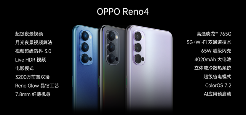 此次發(fā)布會(huì)上,OPPO還發(fā)布了OPPO Reno4,同樣搭載高通驍龍?765G5G芯片及65W超級(jí)閃充;后置搭載4800萬+800萬+200萬超清激光對焦三攝,前置雙攝為3200萬+200萬組合,同樣具備超級(jí)夜景視頻、視頻超級(jí)防抖3.0等視頻拍攝功能。