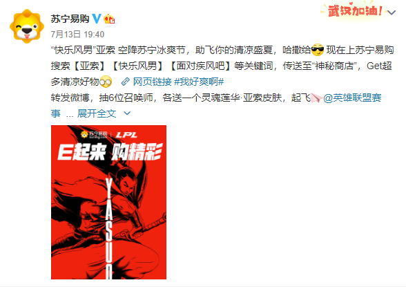 另據(jù)蘇寧官方消息,7月11日~7月18日蘇寧冰爽節(jié)期間,除每千減百、百億補貼,蘇寧冰爽節(jié)亞索主題會場還為英雄聯(lián)盟玩家粉絲帶來了亞索新皮膚“靈魂蓮華”、風扇等好物組成的“快樂大禮包”,用戶可通過下單購物、微博互動等方式獲取。
