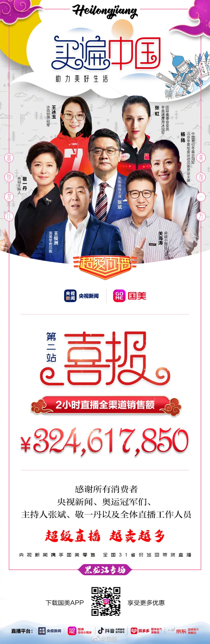 見圳客戶端·深圳新聞網(wǎng)2020年8月4日訊 群星閃耀,再創(chuàng)佳績!7月31日晚20點,“買遍中國·助力美好生活”全國31省份巡回帶貨直播黑龍江專場以3.25億的銷售額收官。出生于黑龍江的中央電視臺著名主持人敬一丹與黑龍江籍冬奧冠軍楊揚、張虹、王冰玉共同組成“龍江四美”,與央視體育頻道主持人張斌一起,展現(xiàn)了黑龍江歷史文化、鄉(xiāng)土風情,介紹了生態(tài)農(nóng)業(yè)發(fā)展,也推薦了諸多美食與好物,并為北京冬奧會助力加油!