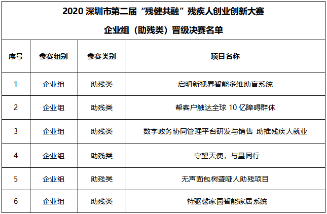 2020深圳市第二屆“殘健共融”殘疾人創(chuàng)業(yè)創(chuàng)新大賽團(tuán)隊(duì)組(助殘類(lèi))晉級(jí)決賽名單