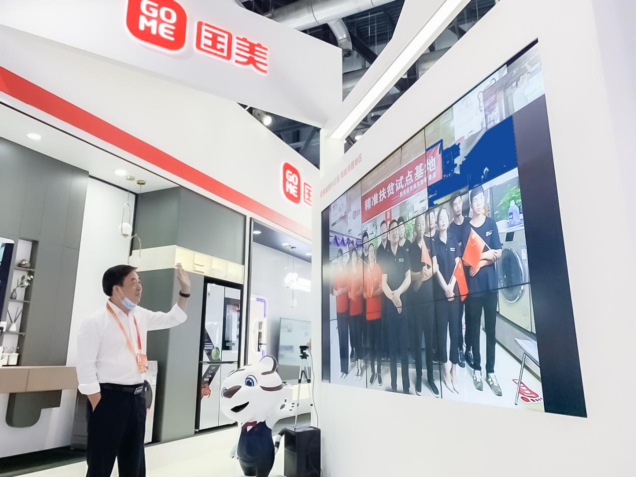 下午,國美零售總裁王俊洲參觀國美展區(qū),通過大屏現(xiàn)場連線了河南省信陽市淮濱縣國美新零售店,并詢問了門店的經(jīng)營狀況。
