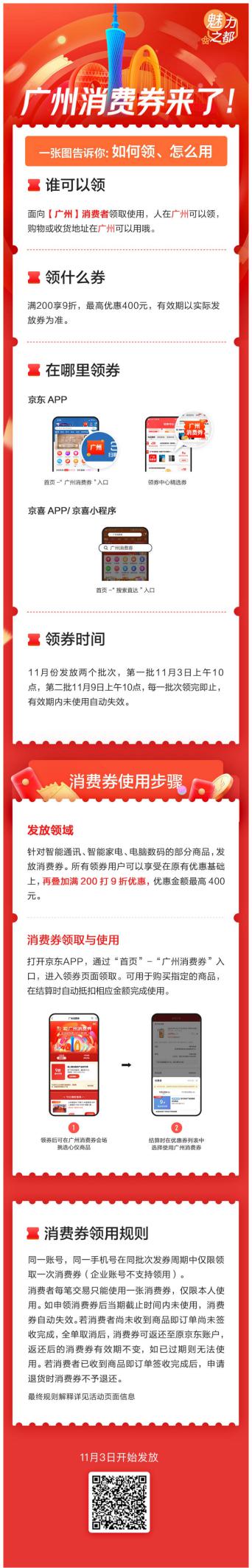 廣州消費(fèi)券將發(fā)放兩個(gè)批次,第一批于11月3日上午10點(diǎn)發(fā)放,第二批于11月9日上午10點(diǎn)發(fā)放,領(lǐng)完即止。廣州消費(fèi)券針對(duì)手機(jī)通訊、智能家電、電腦數(shù)碼等領(lǐng)域的熱銷產(chǎn)品,有效期6天。