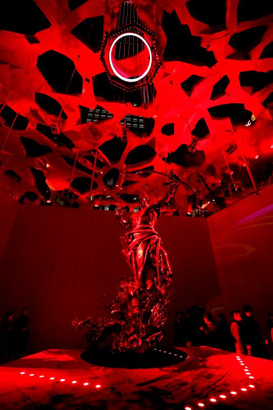 大型沉浸式藝術(shù)裝置“赤子心”橫跨了平安金融中心商場(chǎng)九至十層平臺(tái),總占地面積近四千平方米。在展出十五件大型雕塑作品的同時(shí),將光影藝術(shù)與聲音藝術(shù)巧妙融合,串聯(lián)起虛擬影像與現(xiàn)實(shí)空間,以闡釋純粹、無(wú)畏的赤子之心?!俺嘧有摹笔褂^眾走入藝術(shù)品內(nèi)部、探索藝術(shù)家的內(nèi)心深處,通過(guò)親身參與展覽并與之對(duì)話,從而理解“其大無(wú)外,其小無(wú)內(nèi),世界即內(nèi)心投射”的本質(zhì)。