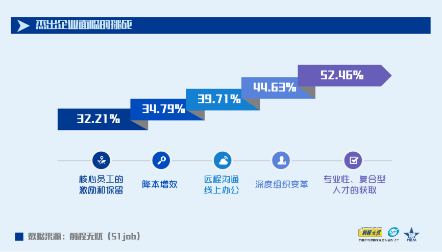 2020年杰出企業(yè)招聘員工總數(shù)較2019年增長了4.21%;55.48%的企業(yè)預(yù)計(jì)人均招聘成本呈增長趨勢,在此前提下,依然有56.04%的企業(yè)預(yù)計(jì)會(huì)在2021年擴(kuò)大招聘來獲取人才優(yōu)勢。894家獲獎(jiǎng)企業(yè)中,有469家將“為籌備未來招募新團(tuán)隊(duì),加大專業(yè)性人才和復(fù)合型人才的獲取“列為本年度企業(yè)人力資源管理所面臨的最大的挑戰(zhàn)。