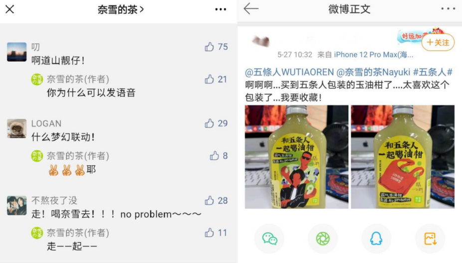 這樣“肆意妄為”的話從五條人嘴里蹦出并不稀奇,他們與生俱來的“平凡生活浪漫主義”,擅長洞察事物的另一面。精妙的是,奈雪的茶洞察到用戶在日常生活中的種種焦慮,將霸氣玉油柑“先澀后甜”的特點比作人生滋味,用這一豁達積極的態(tài)度來輕松正能量地引導,這一點與五條人的精神內核如出一轍。5月27日奈雪的茶X五條人TVC發(fā)布后,不少網(wǎng)友表示這波是“破次元壁”的夢幻聯(lián)動,還有網(wǎng)友在線分享五條人歌曲中有共鳴的歌詞。