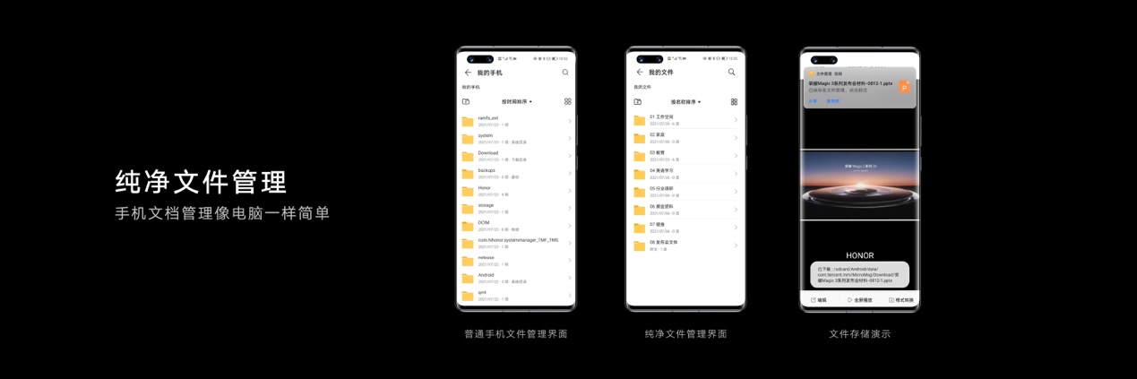 為了幫助事務(wù)繁多的商務(wù)人士更高效管理個(gè)人事務(wù),榮耀還與各辦公平臺(tái)合作,讓用戶(hù)在釘釘、飛書(shū)、Welink、WPS辦公平臺(tái)的日程均能通過(guò)榮耀Magic3系列進(jìn)行統(tǒng)一管理。而新增的純凈文件管理系統(tǒng)(此功能后續(xù)通過(guò) OTA升級(jí)支持),則使榮耀Magic3系列在文件保存和管理方面進(jìn)行進(jìn)一步簡(jiǎn)化,讓手機(jī)文件管理從此可以像電腦一樣簡(jiǎn)單便捷。