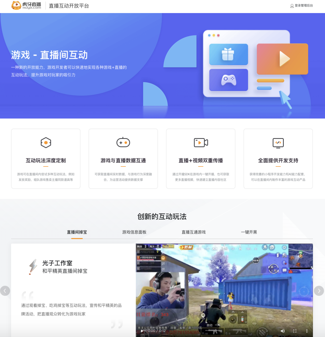 今年3月,虎牙直播互動(dòng)開放平臺(tái)正式上線。通過開放平臺(tái)提供的七大核心開放能力,游戲廠商可以獲得完善的小程序開發(fā)能力和AI能力配套,快速實(shí)現(xiàn)各種“游戲+直播”的互動(dòng)玩法。