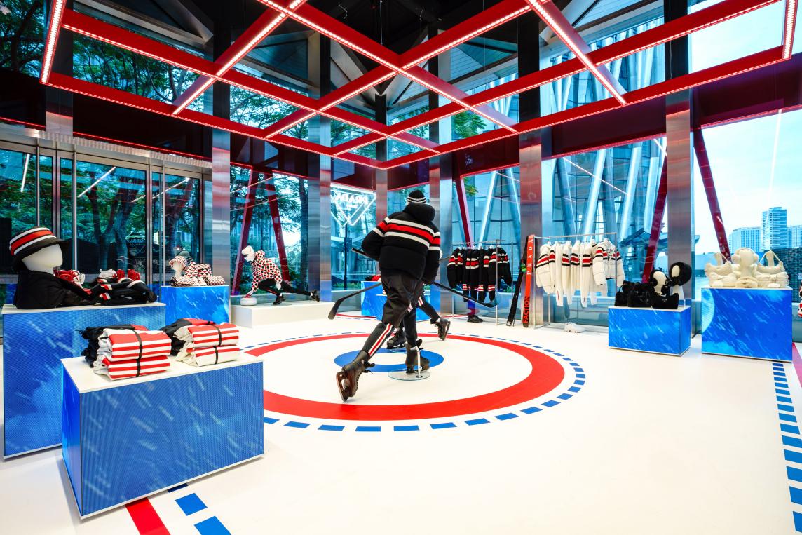 據(jù)了解,全新“冰上普拉達”限時店在深圳灣萬象城亮相,從冰球場線條得到靈感的活力紅藍圖案鋪陳于雪白地面,用臺階元素進行定義,同時,形似記分牌的紅色 LED燈條滾動顯示Prada徽標。體育賽場的看臺搖身變成顧客活動區(qū),雪橇平臺化作展示臺,擺出經(jīng)典運動姿態(tài)的人體模特成為全場焦點。