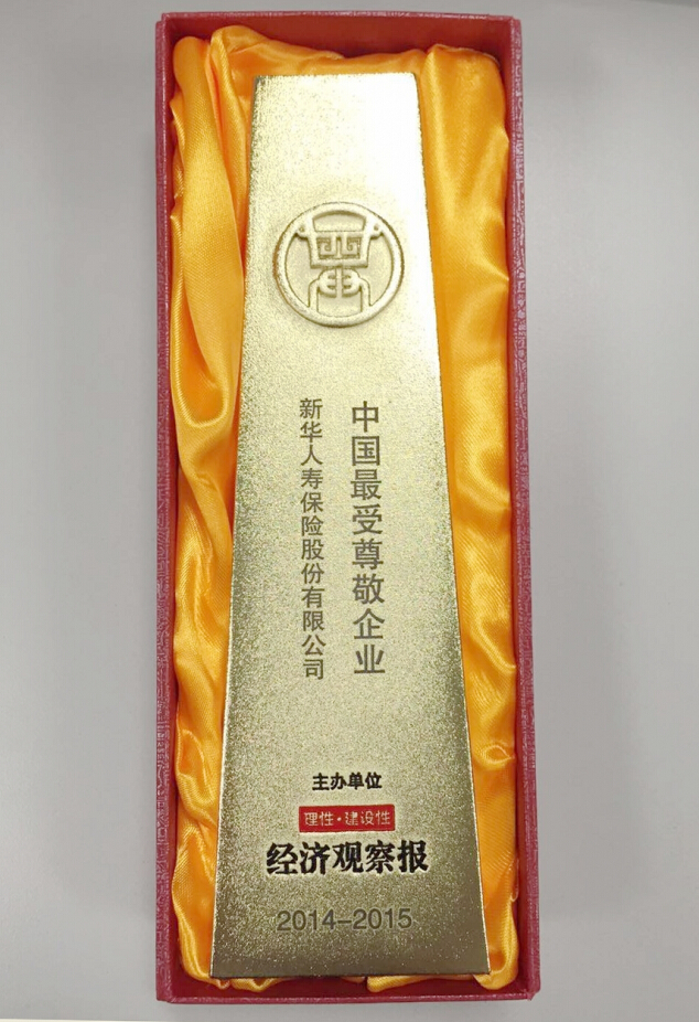 2015年7月,在經(jīng)濟(jì)觀察報主辦的2014-2015中國最受尊敬企業(yè)評選中,新華獲評“中國最受尊敬企業(yè)”獎。中國綠色保險最佳典范企業(yè)2015年8月,在經(jīng)濟(jì)參考報主辦的“2015中國綠色資本論壇暨中國綠色資本品牌榜”活動中,新華保險榮獲“中國綠色保險最佳典范企業(yè)”。2015胡潤品牌百強(qiáng)9月17日,胡潤研究院發(fā)布《2015胡潤品牌榜》顯示,新華保險以120億元的品牌價值占據(jù)榜單第68名,首次進(jìn)入榜單前百強(qiáng),同比強(qiáng)勁上升51位。品牌價值漲幅高達(dá)287%,漲幅居金融業(yè)之首,且是唯一一家進(jìn)入增值品牌十強(qiáng)的金融企業(yè),顯示出新華保險品牌實力的快速提升,以及公司綜合實力的顯著增強(qiáng)。