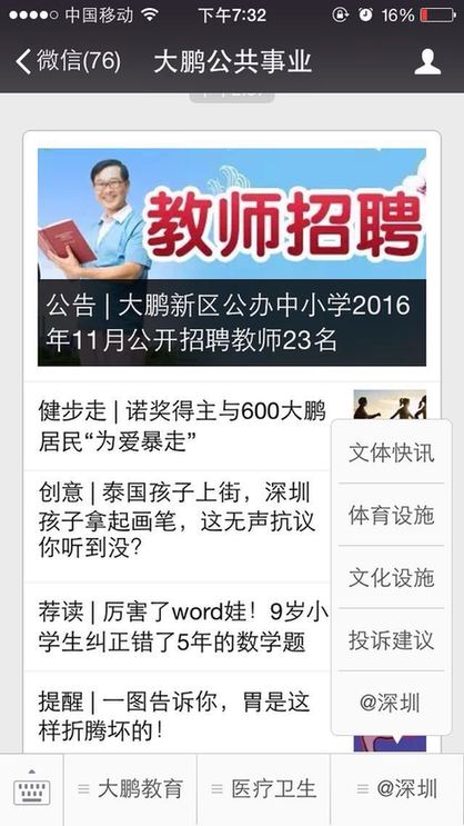 ??? 截止到11月7日,大鵬新區(qū)已有大鵬先鋒、大鵬新區(qū)社區(qū)家園網(wǎng)、大鵬公共事業(yè)、筑夢(mèng)大鵬、、大鵬辦事處等多家政府官方微信公眾號(hào)入駐了@深圳。