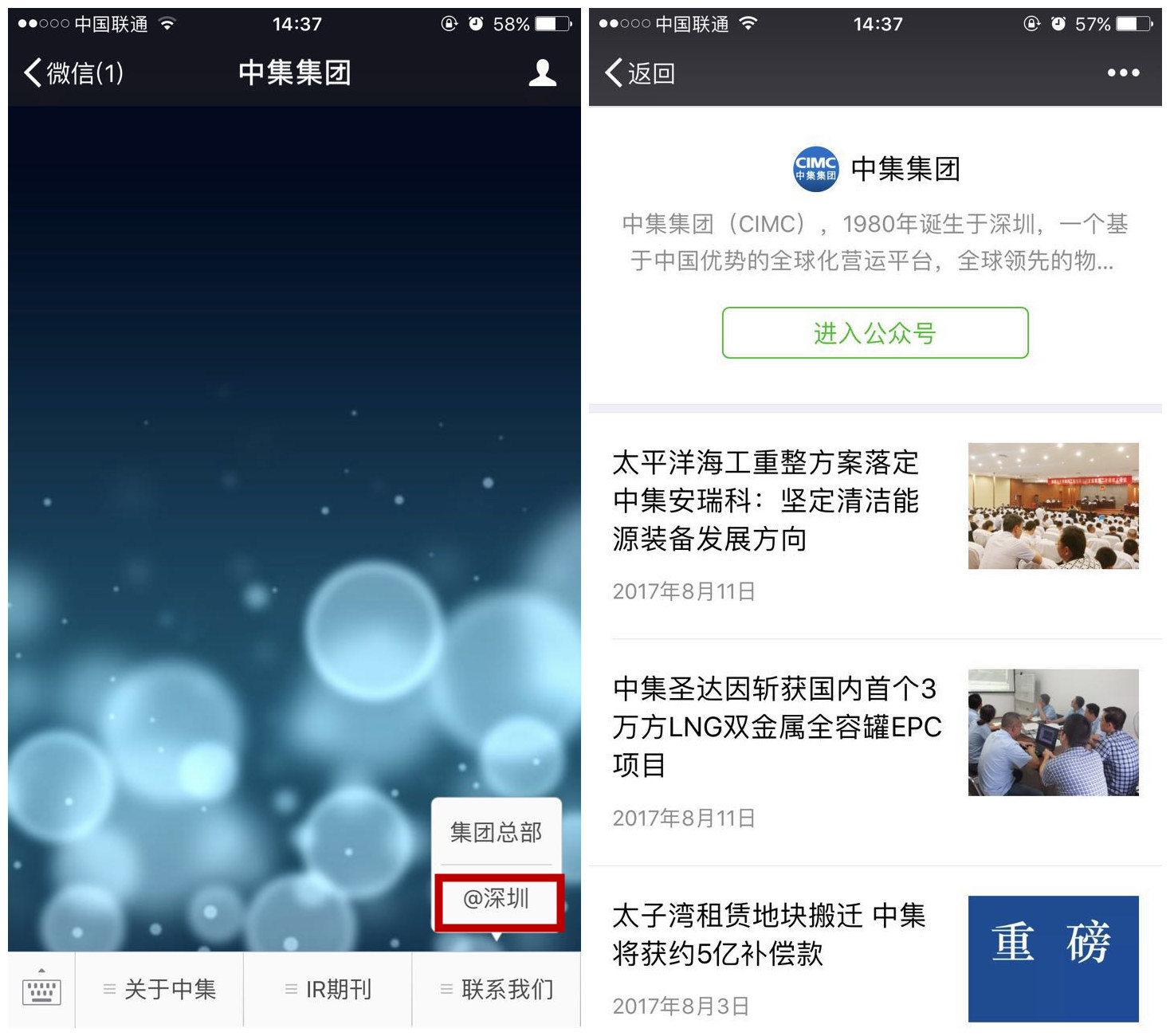深圳新聞網(wǎng)訊(記者 陳飛)近日,中國國際海運集裝箱(集團)股份有限公司(簡稱:中集集團)官方微信公眾號“中集集團”正式入駐@深圳平臺。