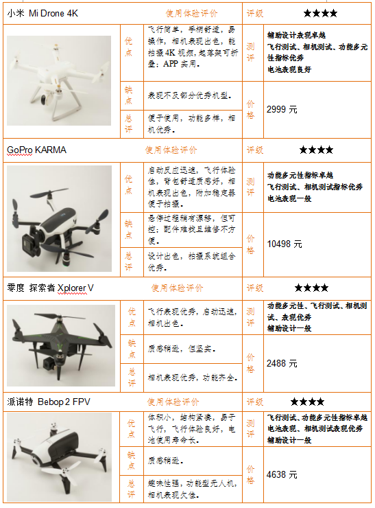 功能多元性:美國GoPro“KARMA”整體評分最佳。