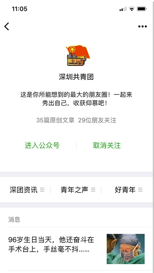 案例介紹:“深圳共青團(tuán)”微信公眾號(hào)于2013年開(kāi)通,是全省最早開(kāi)通的政務(wù)微信號(hào)。在近兩年加大力度建設(shè)和推廣后,粉絲數(shù)有了飛躍性的增長(zhǎng),推送閱讀量和影響力也有了比較明顯的提升。截至目前,累計(jì)推送1700余篇,平均閱讀量1萬(wàn)以上,單篇最高閱讀量達(dá)到36萬(wàn),粉絲數(shù)90余萬(wàn)。目前,公眾號(hào)影響力在全國(guó)地市級(jí)團(tuán)委中排名前3,在全市政務(wù)新媒體中排名前5。在發(fā)布的內(nèi)容上,主要關(guān)注時(shí)政要聞、社會(huì)熱點(diǎn)、政策解讀等與青年息息相關(guān)、喜聞樂(lè)見(jiàn)的話題內(nèi)容,弘揚(yáng)愛(ài)國(guó)精神和時(shí)代精神,是深圳共青團(tuán)聯(lián)系、引導(dǎo)和服務(wù)青年的重要載體。