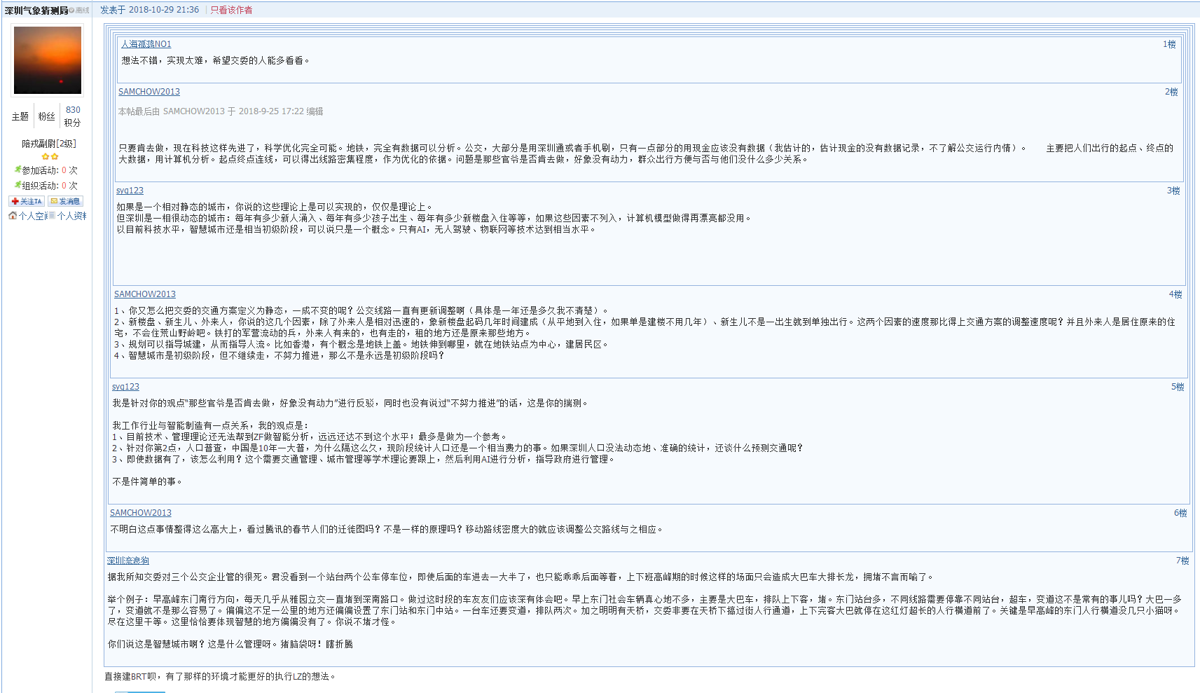9月25日有市民在深圳論壇以《關(guān)于公交線路規(guī)劃和站臺(tái)設(shè)置的一點(diǎn)建議》為題發(fā)帖,自稱是曾經(jīng)的公交人和現(xiàn)在的私家車駕駛員,對(duì)深圳的公交出行一口氣提出3個(gè)意見。帖文中最為吸引人眼球的觀點(diǎn)就是“將全市各站點(diǎn)進(jìn)行編號(hào),采用計(jì)算機(jī)技術(shù),對(duì)編號(hào)站點(diǎn)進(jìn)行排列組合,每個(gè)方向連續(xù)的10個(gè)站點(diǎn)有三條線路覆蓋,超出三條屬于線路密度高或規(guī)劃不合理。”單這一句話就在跟帖中引發(fā)了針鋒相對(duì)的辯論,有支持的市民認(rèn)為:主意不錯(cuò),實(shí)現(xiàn)起來(lái)應(yīng)該也難度不大?,F(xiàn)在不是整天提什么物聯(lián)網(wǎng)、大數(shù)據(jù)、智慧城市么,這個(gè)不就是這些高新技術(shù)在公交出行方面的應(yīng)用。不看好的市民則認(rèn)為:目前技術(shù)、管理理論還無(wú)法做智能分析,遠(yuǎn)遠(yuǎn)還達(dá)不到這個(gè)水平,“最多是做為一個(gè)參考”。