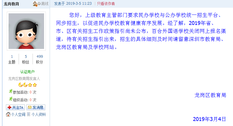 3月5日11時23分,龍崗區(qū)教育局官方賬號發(fā)布回應(yīng)網(wǎng)帖,回應(yīng)稱“上級教育主管部門要求民辦學(xué)校與公辦學(xué)校統(tǒng)一招生平臺、同步招生,以促進民辦學(xué)校教育健康有序發(fā)展。”“2019年省、市、區(qū)有關(guān)招生工作政策指引尚未公布,百合外國語學(xué)校關(guān)閉網(wǎng)上報名渠道,待有關(guān)招生指引出來,招生的具體細(xì)則及時間請留意深圳市教育局、龍崗區(qū)教育局及學(xué)校網(wǎng)站。”