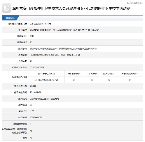 記者從羅湖區(qū)政府在線了解到,1月29日,羅湖區(qū)衛(wèi)生和計(jì)劃生育局對(duì)市民投訴的門診部已作處罰,處罰事由為,深圳常安門診部使用衛(wèi)生技術(shù)人員開展注冊(cè)專業(yè)外的醫(yī)療衛(wèi)生技術(shù)活動(dòng),罰款金額為20000元。與此同時(shí),針對(duì)市民投訴違規(guī)行醫(yī)的醫(yī)生也作了處罰,處罰理由為,開展注冊(cè)專業(yè)以外的醫(yī)療衛(wèi)生技術(shù)活動(dòng),罰款金額為5000元。