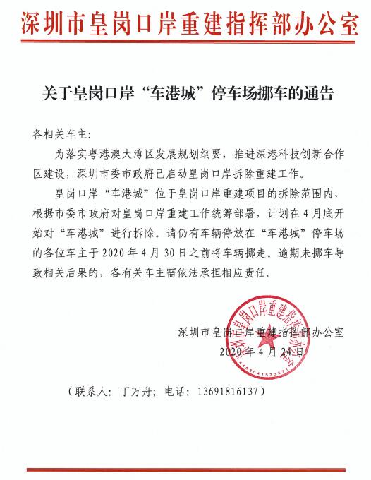 據(jù)了解,皇崗口岸“車港城”位于皇崗口岸重建項目的拆除范圍內,根據(jù)市委市政府對皇崗口岸重建工作統(tǒng)籌部署,計劃在4月底開始對“車港城”進行拆除。請仍有車輛停放在“車港城”停車場的各位車主于2020年4月30日之前將車輛挪走,逾期未挪車導致相關后果的,各有關車主需依法承擔相應責任。