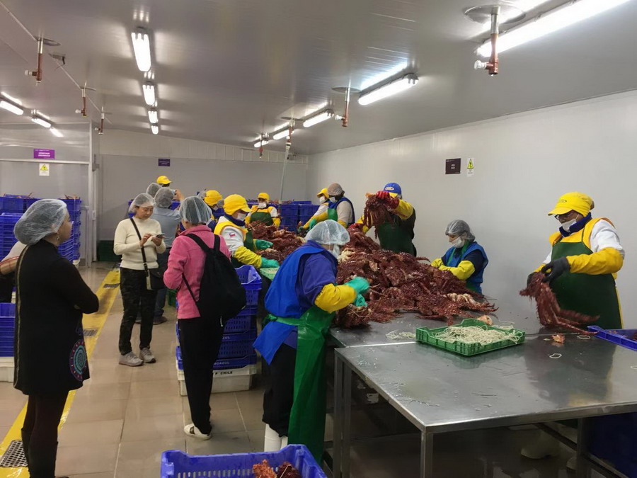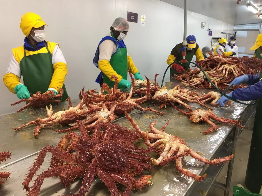 據(jù)介紹,蜘蛛蟹是用一種鐵籠子放入深海誘捕的,智利政府規(guī)定,小于1.5公斤的不許捕撈,因此,鐵籠的孔隙會(huì)放走幼小的蜘蛛蟹。李仁奇攝