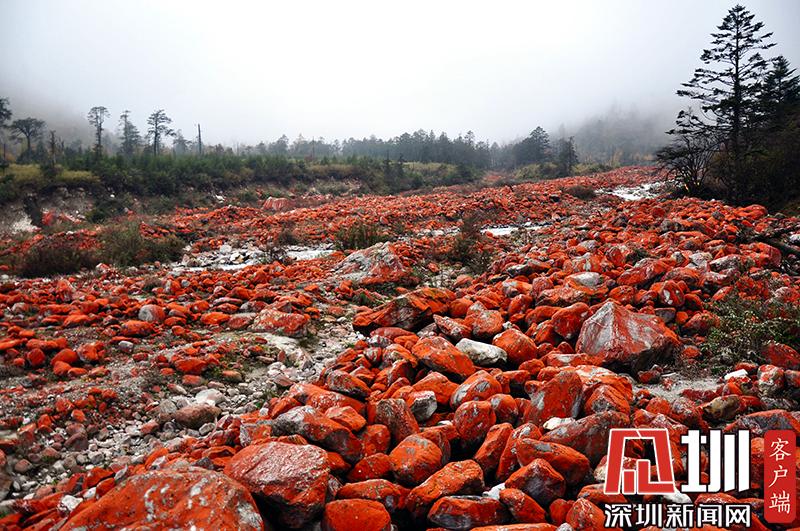 紅石對(duì)生長環(huán)境的要求極為苛刻,空氣潔凈度、濕度、水的清潔度都會(huì)影響它們的生長。雅家梗一代低碳富氧的空氣、冰山融雪的溪流、森林茂密的植被,為紅石的生長繁衍提供了最理想的環(huán)境。在這里,紅石密布于近百米寬的河谷里,不同的季節(jié),不同的天氣狀況下,幻化出不同的色彩,呈現(xiàn)朝紅夕褚的奇異景觀。