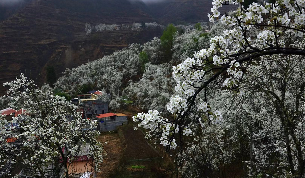 梨花叢中的村寨。李仁奇 攝