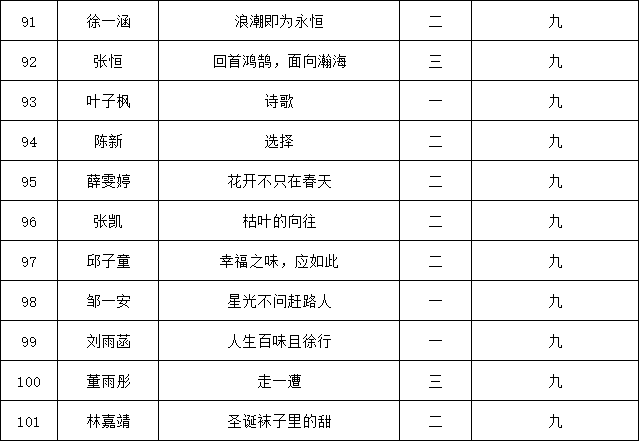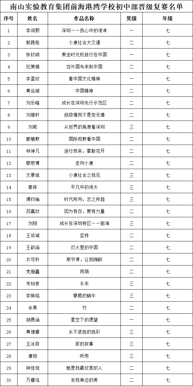 自2021年1月,活動征稿啟動以來,獲得了深圳市廣大中小學(xué)生、教師、文學(xué)愛好者的熱烈響應(yīng)積極參與,吸引了深圳百余所學(xué)校的上萬人關(guān)注報名?,F(xiàn)公布南山實驗教育集團(tuán)前海港灣學(xué)校(初中部)專場晉級復(fù)賽名單如下: