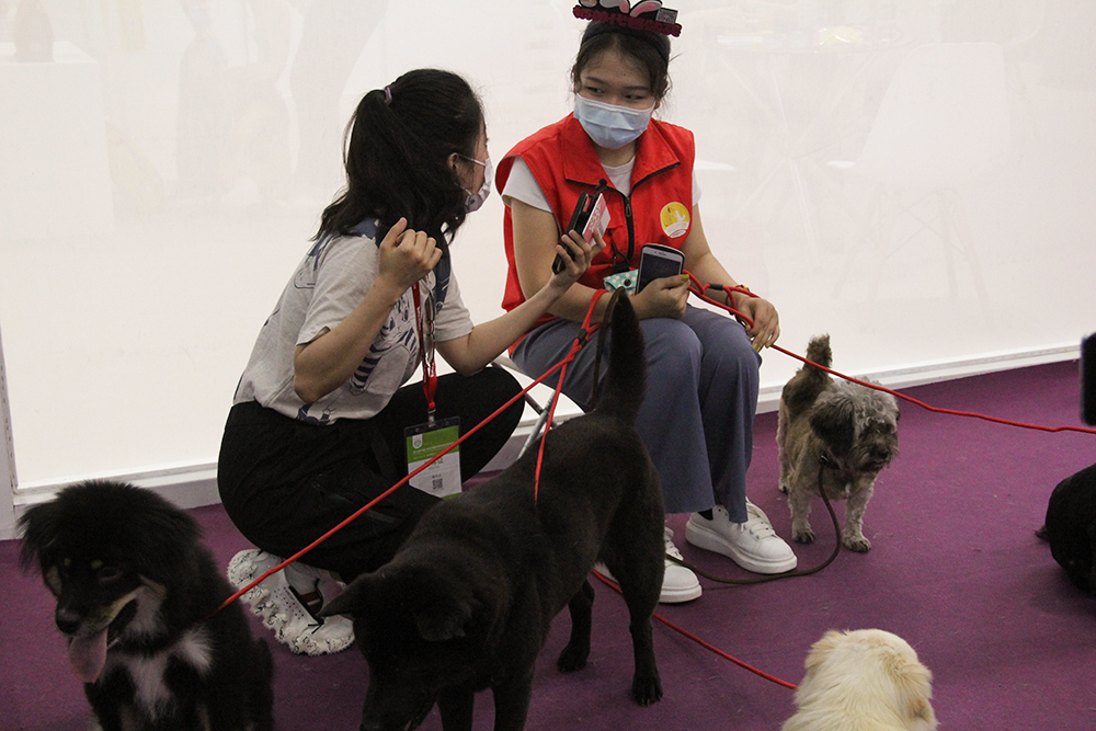 流浪犬救助組織的義工在向記者介紹待領(lǐng)養(yǎng)犬只的情況。