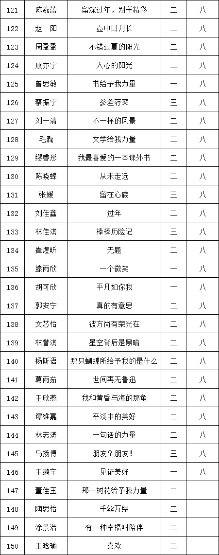 自2021年1月,活動征稿啟動以來,獲得了深圳市廣大中小學(xué)生、教師、文學(xué)愛好者的熱烈響應(yīng)積極參與,吸引了深圳百余所學(xué)校的上萬人關(guān)注報(bào)名?,F(xiàn)公布福田區(qū)梅山中學(xué)晉級復(fù)賽名單如下: