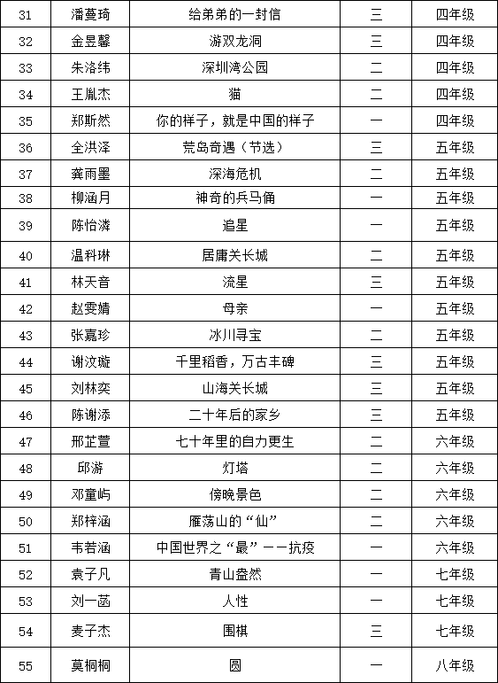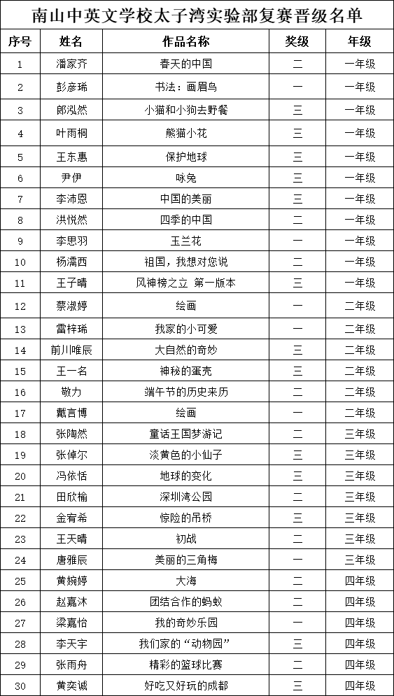 自2021年1月,活動(dòng)征稿啟動(dòng)以來,獲得了深圳市廣大中小學(xué)生、教師、文學(xué)愛好者的熱烈響應(yīng)積極參與,吸引了深圳百余所學(xué)校的上萬人關(guān)注報(bào)名?,F(xiàn)公布南山中英文學(xué)校太子灣實(shí)驗(yàn)部晉級(jí)復(fù)賽名單如下: