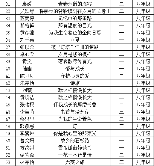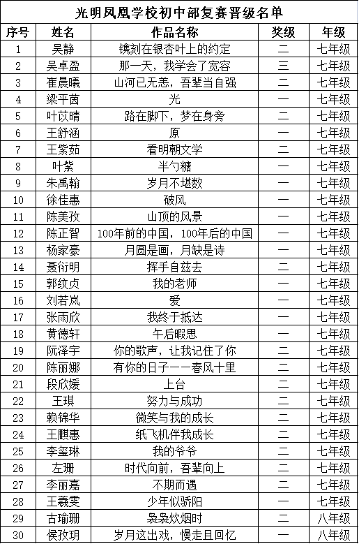 自2021年1月,活動(dòng)征稿啟動(dòng)以來,獲得了深圳市廣大中小學(xué)生、教師、文學(xué)愛好者的熱烈響應(yīng)積極參與,吸引了深圳百余所學(xué)校的上萬人關(guān)注報(bào)名?,F(xiàn)公布光明區(qū)鳳凰學(xué)校晉級(jí)復(fù)賽名單如下: