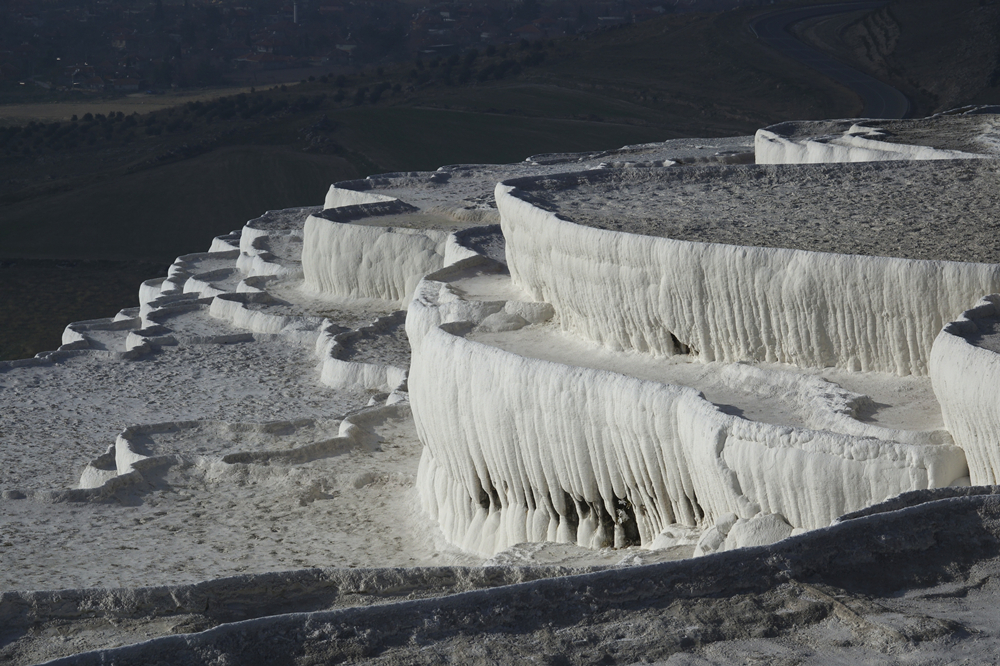 終年維持攝氏29度的溫泉水在山崖上經過億萬年流動,其中的礦物質沉淀下來,把整個山坡染成白色的露天溶巖,遠看形似堆積如山的棉花,一腳踩上去,才知道是堅硬的白色石灰?guī)r。由于一層又一層的巖石形狀很像城堡,故得名棉花堡。李仁奇 攝
