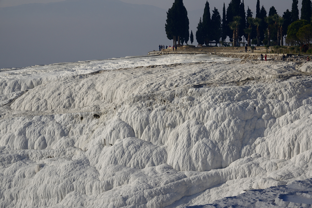 終年維持?jǐn)z氏29度的溫泉水在山崖上經(jīng)過億萬年流動,其中的礦物質(zhì)沉淀下來,把整個山坡染成白色的露天溶巖,遠(yuǎn)看形似堆積如山的棉花,一腳踩上去,才知道是堅硬的白色石灰?guī)r。由于一層又一層的巖石形狀很像城堡,故得名棉花堡。李仁奇 攝