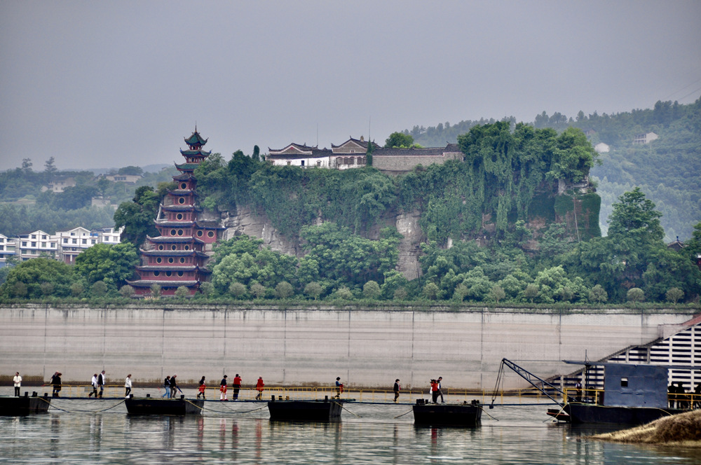 三峽庫區(qū)蓄水后,石寶寨被一道水泥圍堰保護(hù)起來,成為孤島,與江岸的聯(lián)系全憑一座吊橋,又被比喻為“世界最大的盆景”、“永不沉沒的航空母艦”。李仁奇 攝