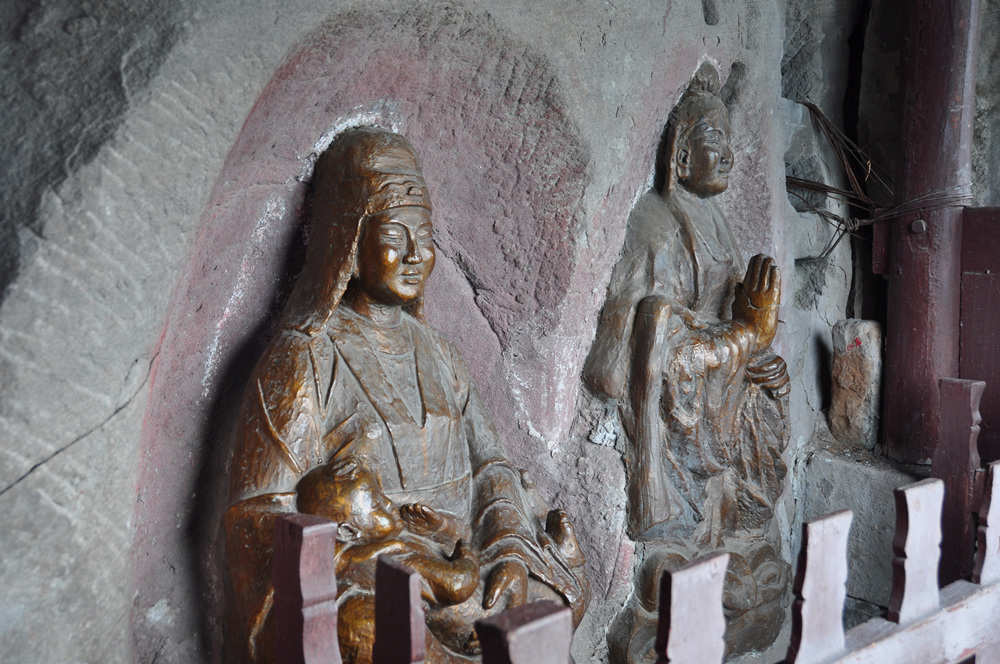 山頂有古剎天子殿,創(chuàng)建于康熙、乾隆年間,是此寨最高點。正殿墻壁有女媧補(bǔ)天故事的壁畫,畫下方,有一遺石,似石寶寨。李仁奇 攝