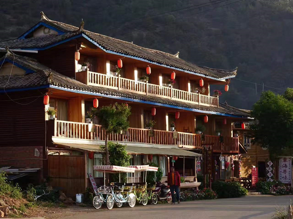 沿湖岸都是摩梭人家的木房子,現在多數都改造為可提供住宿的旅館。李仁奇 攝