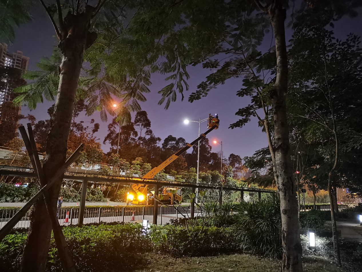 身穿深圳照明馬甲的工作人員正在對路燈進(jìn)行維修更換(11月25日攝)