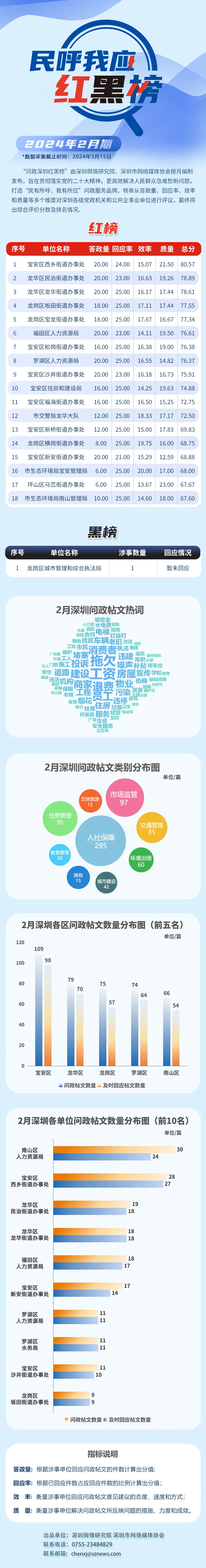本期榜單采集的帖文主要來自深圳論壇、深圳各區(qū)政府官網、人民網領導留言板及深圳新聞網“民呼我應”等平臺,所采集帖文發(fā)布時間為2024年2月1日至2月29日,采集截止時間為2024年3月15日。榜單具有科學、合理、完備的綜合評價體系,能夠從答政量、回應率、效率和質量等多個維度對深圳各級黨政機關和公共企事業(yè)單位進行評議。