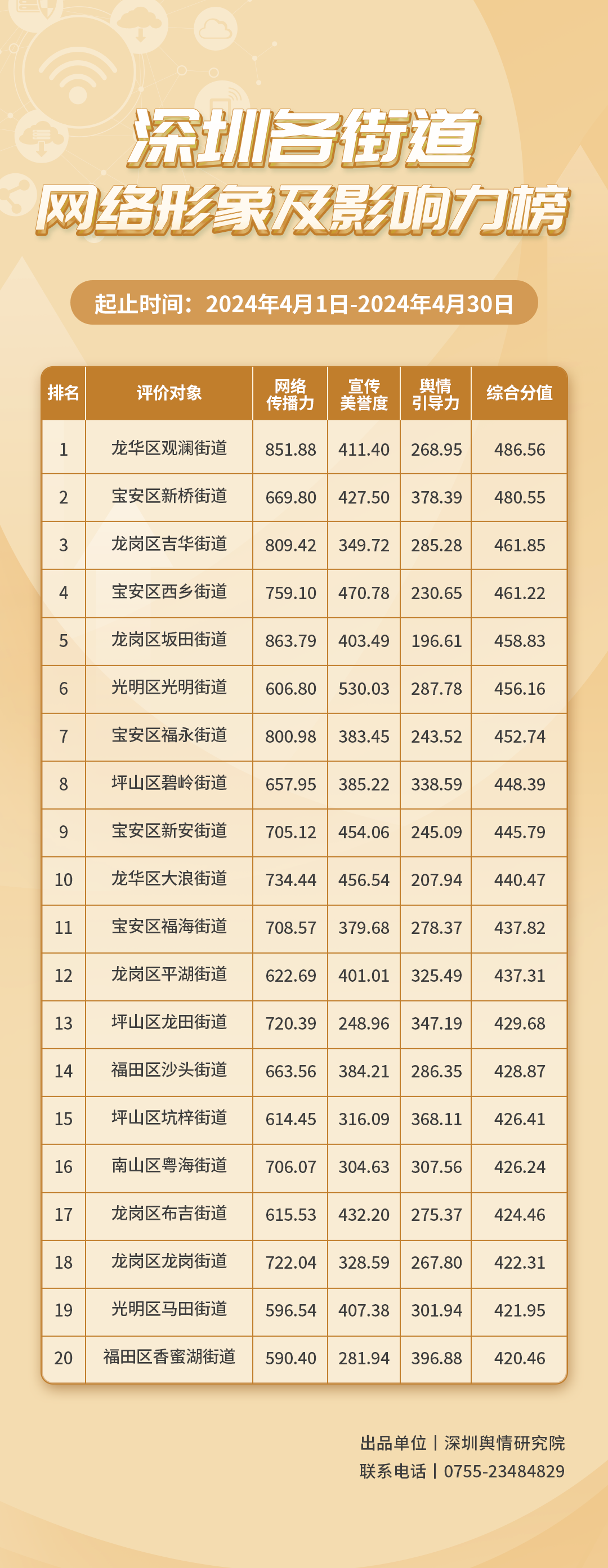 《深圳各街道網(wǎng)絡(luò)形象及影響力榜》由深圳輿情研究院編制推出,具有獨(dú)立客觀的評價(jià)體系,旨在深入了解深圳市各街道的網(wǎng)絡(luò)形象構(gòu)建狀況和社會影響,推動街道治理“提質(zhì)增效”,增加城市高質(zhì)量發(fā)展動能。