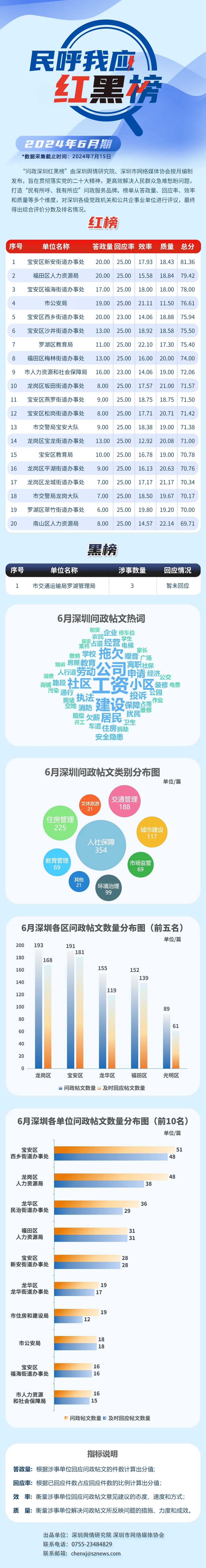 2024年6月,共有20家單位因積極解決民生問題,認(rèn)真細(xì)致答政,登上“紅榜”,它們分別是:寶安區(qū)新安街道辦事處、福田區(qū)人力資源局、寶安區(qū)福海街道辦事處、市公安局、寶安區(qū)西鄉(xiāng)街道辦事處、寶安區(qū)沙井街道辦事處、羅湖區(qū)教育局、福田區(qū)梅林街道辦事處、市人力資源和社會保障局、龍崗區(qū)坂田街道辦事處、寶安區(qū)燕羅街道辦事處、寶安區(qū)松崗街道辦事處、市交警局寶安大隊、龍崗區(qū)寶龍街道辦事處、寶安區(qū)教育局、龍崗區(qū)平湖街道辦事處、龍崗區(qū)龍城街道辦事處、市交警局龍崗大隊、羅湖區(qū)翠竹街道辦事處、南山區(qū)人力資源局。另外,市交通運輸局羅湖管理局因相關(guān)帖文回應(yīng)率偏低,整體答政效果不佳,被列入“黑榜”。