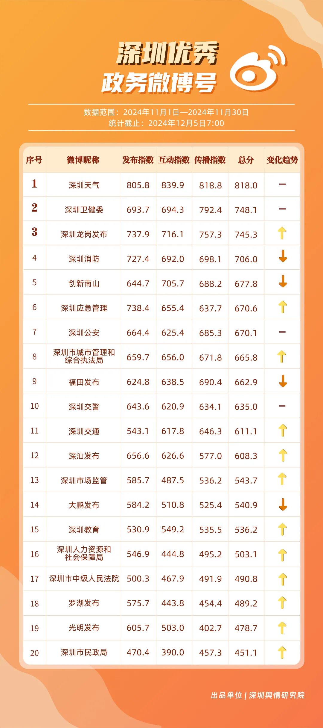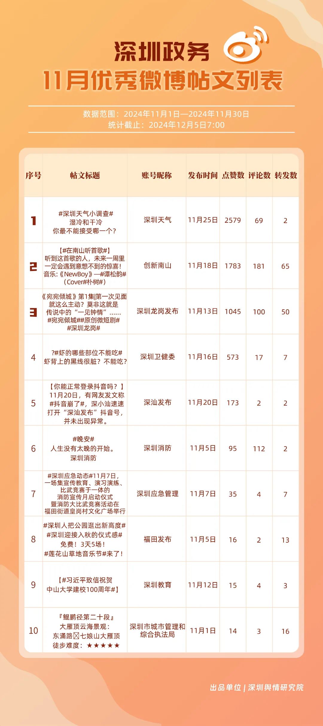 11月,“深圳天氣”“深圳衛(wèi)健委”“深圳龍崗發(fā)布”“深圳消防”“創(chuàng)新南山”“深圳應(yīng)急管理”“深圳公安”“深圳市城市管理和綜合執(zhí)法局”“福田發(fā)布”“深圳交警”等20個(gè)賬號(hào)入選“優(yōu)秀政務(wù)微博號(hào)”。“深圳天氣”“深圳衛(wèi)健委”賬號(hào)在信息傳播上不斷精進(jìn),為市民帶來及時(shí)、優(yōu)質(zhì)且高效的資訊,內(nèi)容緊貼民生,贏得了市民的廣泛贊譽(yù),排名穩(wěn)定在前2名。同時(shí),“深圳龍崗發(fā)布”“深圳消防”和“創(chuàng)新南山”等賬號(hào)也能夠精準(zhǔn)滿足市民的信息需求,并在此基礎(chǔ)上提升市民閱讀體驗(yàn),推動(dòng)了其在榜單上的穩(wěn)步提升,彰顯了政務(wù)微博的創(chuàng)新活力與社會(huì)價(jià)值。