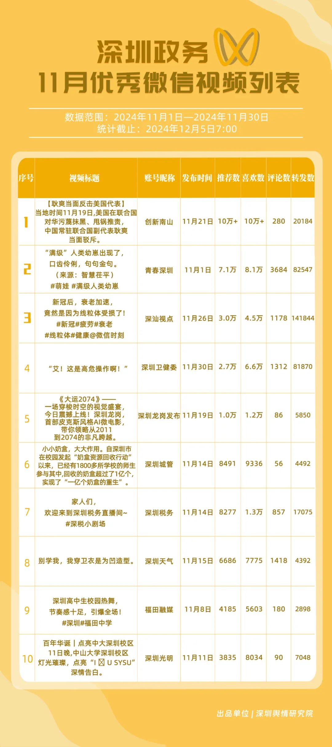 11月,獲“深圳優(yōu)秀政務(wù)微信視頻號(hào)”稱號(hào)的分別是“深汕視點(diǎn)”“青春深圳”“深圳衛(wèi)健委”“創(chuàng)新南山”“深圳龍崗發(fā)布”“福田融媒”“深圳教育”“深圳天氣”“深圳稅務(wù)”“深圳光明”。其中,“深汕視點(diǎn)”與“青春深圳”通過積極轉(zhuǎn)發(fā)涵蓋廣泛領(lǐng)域的優(yōu)質(zhì)視頻內(nèi)容,贏得了網(wǎng)民的廣泛點(diǎn)贊與推薦,彰顯了其在內(nèi)容聚合與傳播上的獨(dú)到之處?!吧钲谛l(wèi)健委”則專注于衛(wèi)生健康領(lǐng)域,發(fā)布了一系列高質(zhì)量的內(nèi)容,深受網(wǎng)民喜愛,進(jìn)一步鞏固了其在健康傳播領(lǐng)域的領(lǐng)先地位。