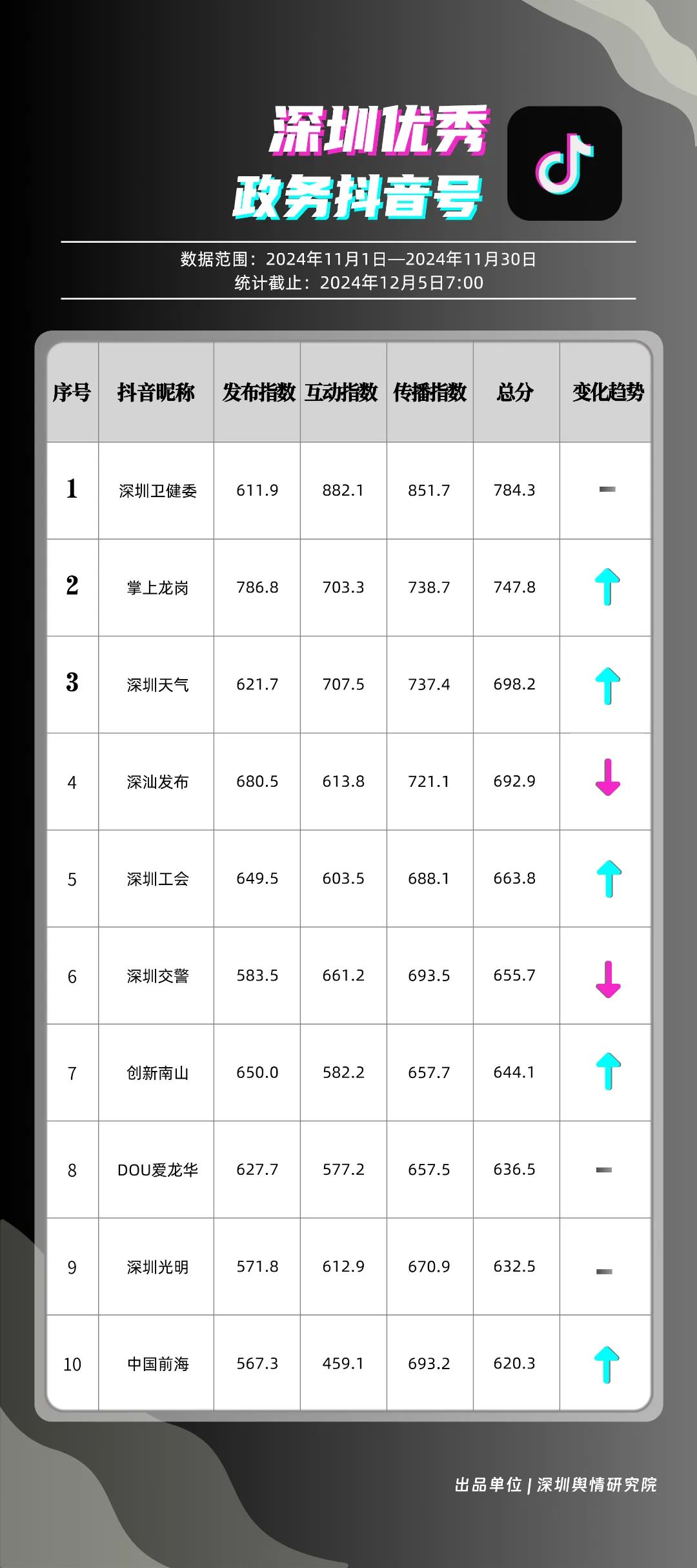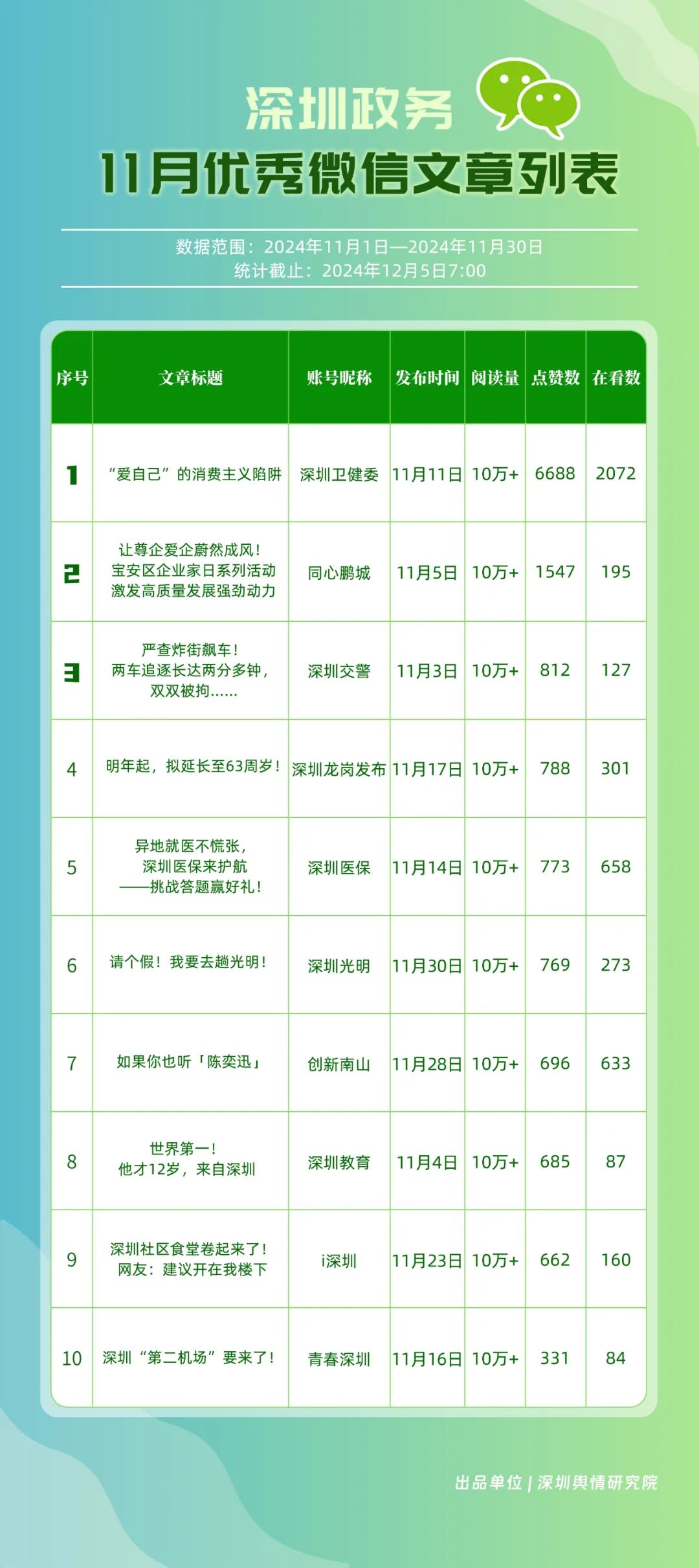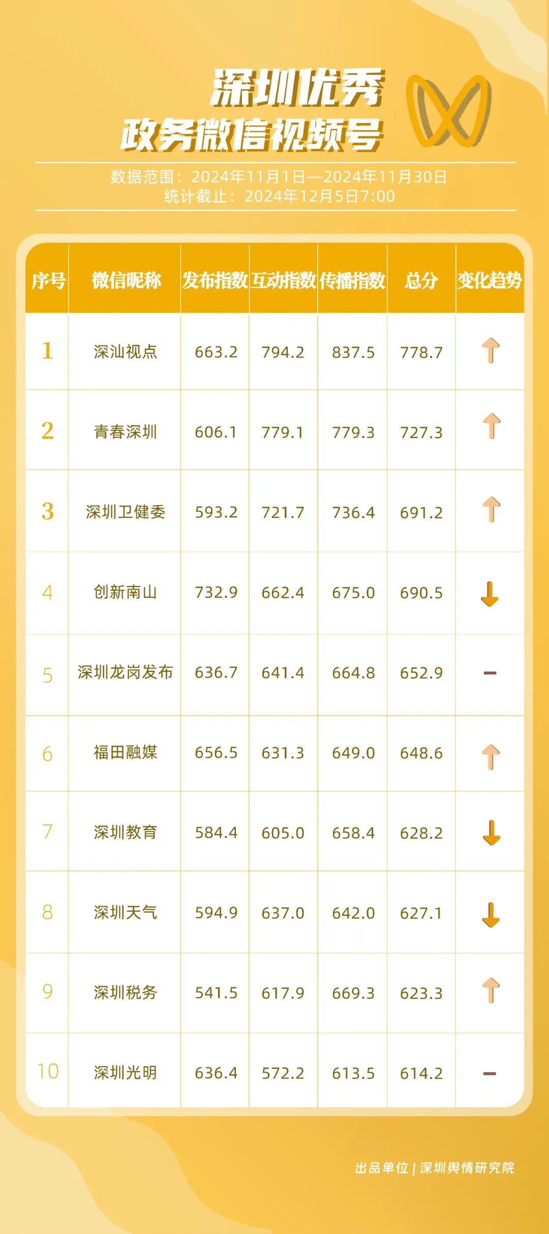 11月,“深圳衛(wèi)健委”“深圳龍崗發(fā)布”“幸福福田”“i深圳”“創(chuàng)新南山”“青春深圳”“深圳光明”“深圳工會(huì)”“深圳教育”“深圳龍華”等30個(gè)賬號(hào)入選“深圳優(yōu)秀政務(wù)微信公眾號(hào)”。其中,“深圳衛(wèi)健委”以802.2分位于榜單首位,“深圳龍崗發(fā)布”“幸福福田”“i深圳”排名保持靠前?!皠?chuàng)新南山”“深圳光明”則憑借內(nèi)容質(zhì)量、創(chuàng)新性的提升,展現(xiàn)了政務(wù)宣傳的新活力,排名有所提升。