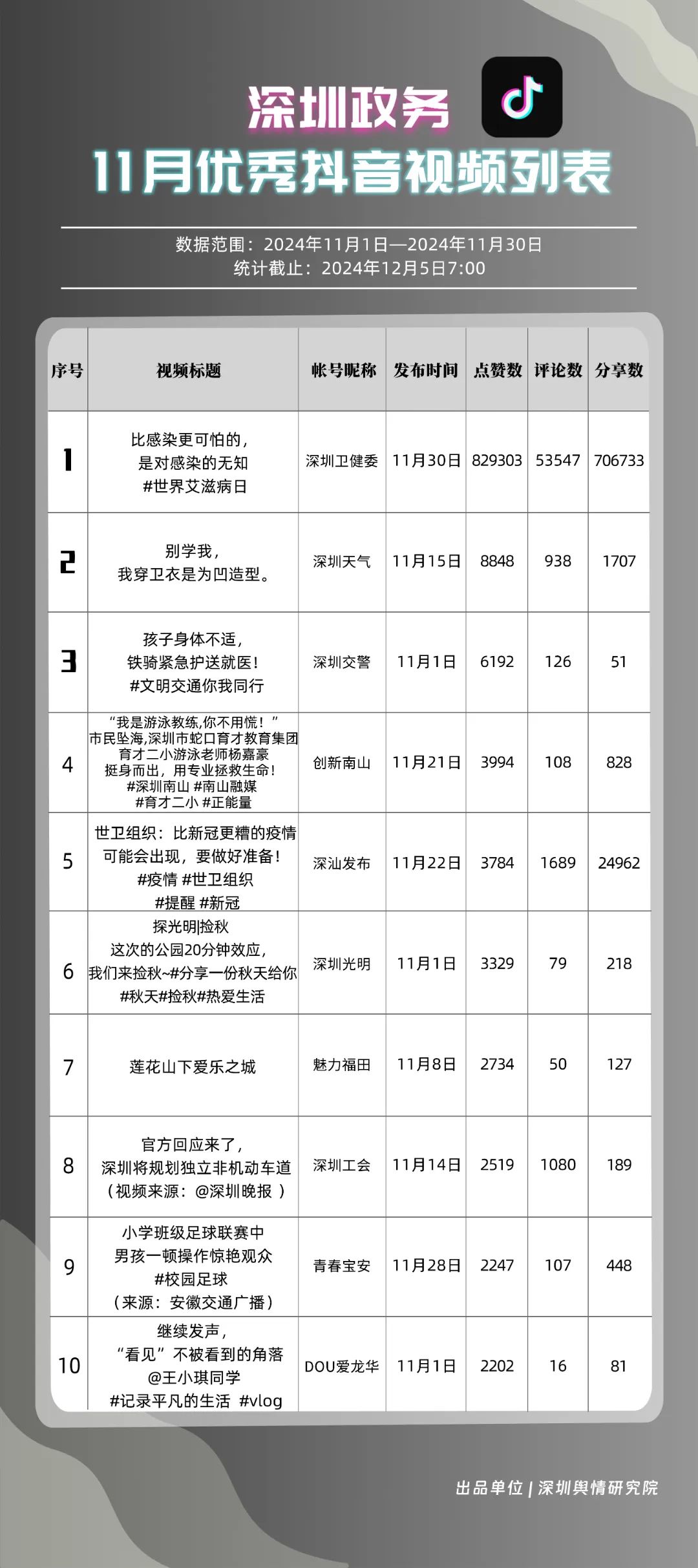 11月,“深圳衛(wèi)健委”“掌上龍崗”“深圳天氣”“深汕發(fā)布”“深圳工會(huì)”“深圳交警”“創(chuàng)新南山”“DOU愛龍華”“深圳光明”“中國前?!惫?0個(gè)政務(wù)抖音號(hào)獲得“深圳優(yōu)秀政務(wù)抖音號(hào)”稱號(hào)。“深圳衛(wèi)健委”憑借高質(zhì)量劇情內(nèi)容,巧妙融入健康知識(shí),視頻累計(jì)收獲近百萬點(diǎn)贊。同時(shí),“掌上龍崗”和“深圳天氣”也在視頻內(nèi)容創(chuàng)新上不斷探索,通過優(yōu)化宣傳策略和信息傳播方式,使得網(wǎng)民能夠在輕松愉快的氛圍中了解龍崗區(qū)的最新動(dòng)態(tài)和深圳的天氣信息,展現(xiàn)了政務(wù)抖音號(hào)的獨(dú)特魅力與社會(huì)影響力。