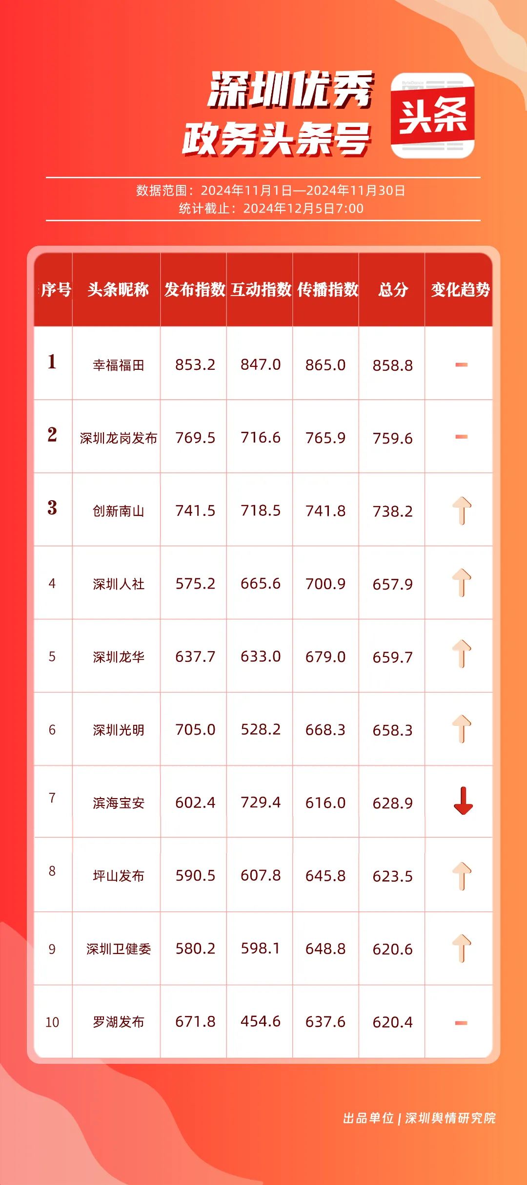 11月,“幸福福田”“深圳龍崗發(fā)布”“創(chuàng)新南山”“深圳人社”“深圳龍華”“深圳光明”“濱海寶安”“坪山發(fā)布”“深圳衛(wèi)健委”“羅湖發(fā)布”共10個(gè)政務(wù)頭條號(hào)入選“優(yōu)秀政務(wù)頭條號(hào)”榜單?!靶腋8L铩卑l(fā)布大量民生相關(guān)信息,穩(wěn)居第一。“深圳龍崗發(fā)布”同樣表現(xiàn)不凡,排名始終位于前列,展現(xiàn)了其在信息傳播與政務(wù)服務(wù)方面的卓越能力。此外,賬號(hào)“創(chuàng)新南山”“深圳人社”“深圳龍華”“深圳光明”在榜單中的排名有所提升,為政務(wù)新媒體樹立了典范。