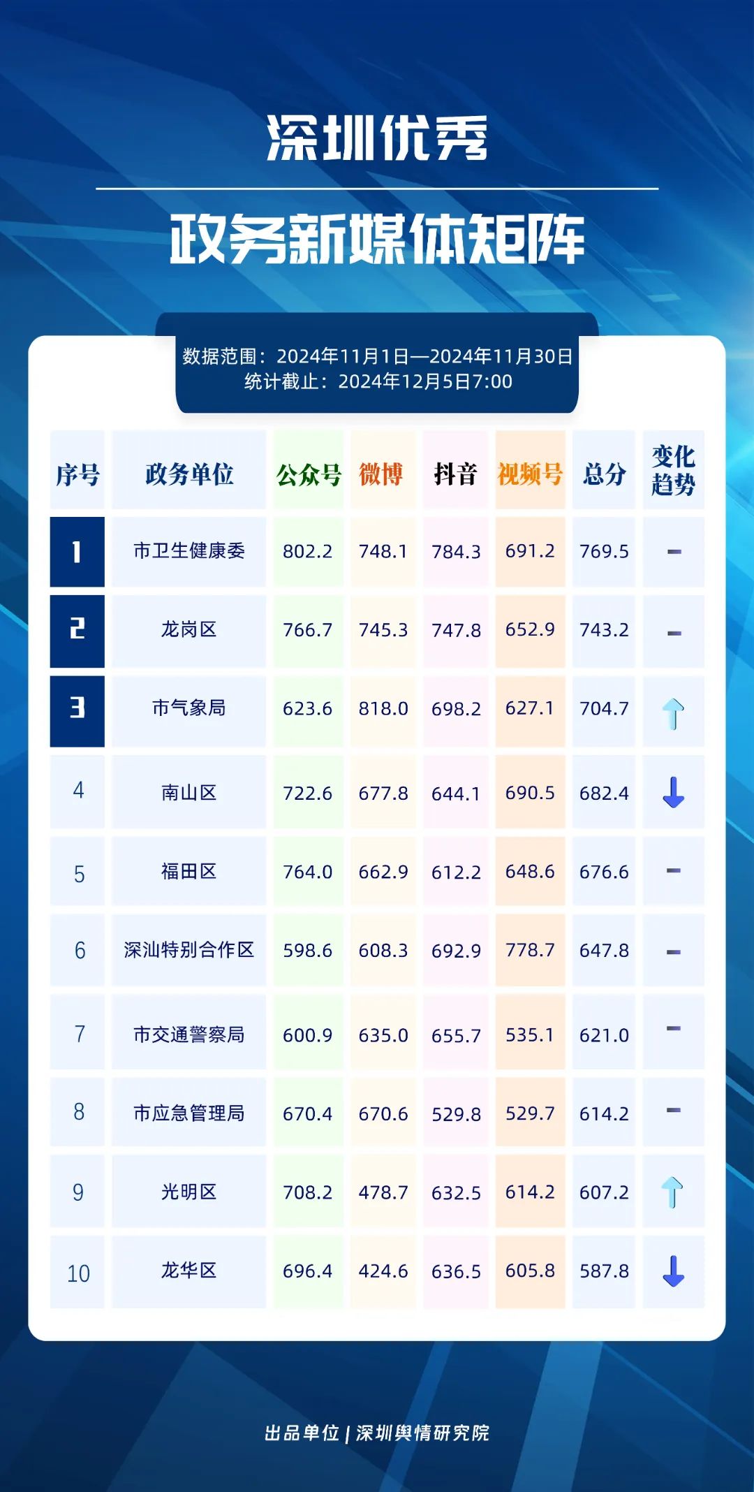 11月,市衛(wèi)生健康委、龍崗區(qū)、市氣象局、南山區(qū)、福田區(qū)、深汕特別合作區(qū)、市交通警察局、市應(yīng)急管理局、光明區(qū)、龍華區(qū)榮登“深圳優(yōu)秀政務(wù)新媒體矩陣”榜單。11月,市衛(wèi)生健康委新媒體矩陣持續(xù)深耕衛(wèi)生健康領(lǐng)域,穩(wěn)固占據(jù)榜單首位。龍崗區(qū)新媒體矩陣則在多平臺(tái)發(fā)布《宛宛傾城》這一劇情類視頻,展現(xiàn)了其在內(nèi)容創(chuàng)新上的積極探索。市氣象局新媒體矩陣則以多樣化的天氣播報(bào)形式,贏得了廣泛好評(píng),位列榜單第三名。同時(shí),南山區(qū)、福田區(qū)、深汕特別合作區(qū)等新媒體矩陣在各平臺(tái)展現(xiàn)出不凡實(shí)力,憑借各自優(yōu)勢(shì)與精彩的內(nèi)容,在《深圳優(yōu)秀政務(wù)新媒體矩陣》榜單中取得靠前名次。