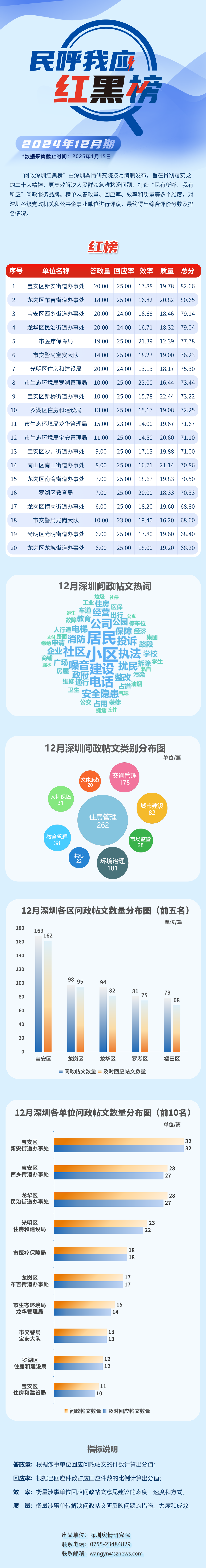 “深圳民呼我應(yīng)紅黑榜”由深圳輿情研究院按月編制發(fā)布,旨在貫徹落實黨的二十大精神,更高效解決人民群眾急難愁盼問題,打造“民有所呼、我有所應(yīng)”問政服務(wù)品牌。榜單從答政量、回應(yīng)率、效率和質(zhì)量等多個維度對深圳各級黨政機關(guān)和公共企事業(yè)單位進行評議,最終得出綜合評價分?jǐn)?shù)及排名情況。
