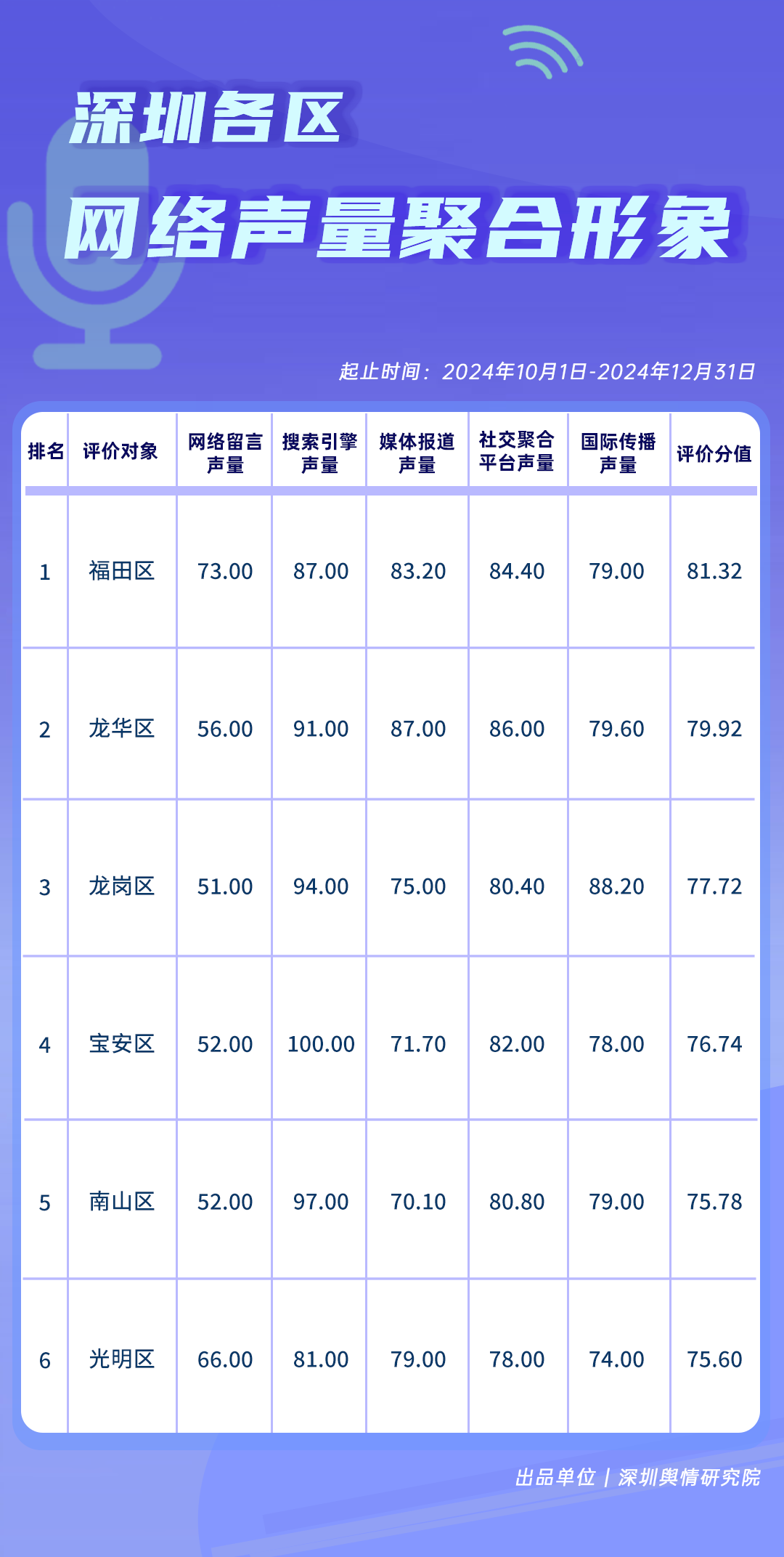 為全面評估深圳各區(qū)各單位網(wǎng)絡形象建設情況,助力各區(qū)各單位持續(xù)響應居民對美好生活的期許,賦能城市高質(zhì)量發(fā)展,深圳輿情研究院推出“深圳各區(qū)各單位網(wǎng)絡形象建設榜”,從網(wǎng)絡聚合聲量、留言互動成效、社會生活評價、輿情管理能力及新媒體傳播水平等方面,多維度分析深圳各區(qū)(含大鵬新區(qū)、深汕特別合作區(qū))、各市直單位(市直屬單位、直屬部門)的網(wǎng)絡形象建設成果,凸顯各區(qū)各單位的“共性”與“個性”。