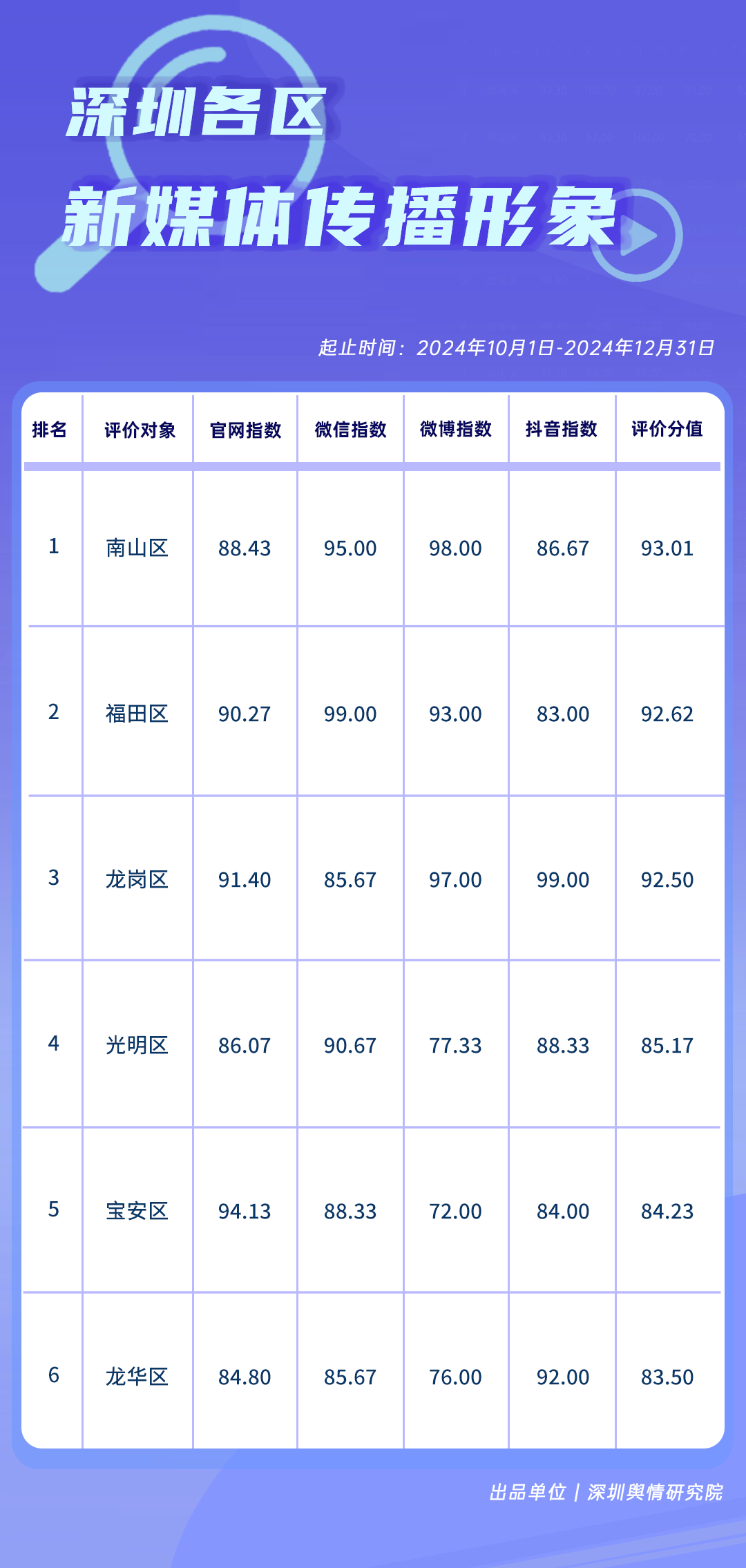 各區(qū)各單位在網(wǎng)絡形象建設領域取得了哪些成績?《深圳各區(qū)各單位網(wǎng)絡形象建設榜》(10-12月期)為您詳細揭曉,本期榜單數(shù)據(jù)統(tǒng)計時間范圍為2024年10月1日至12月31日。