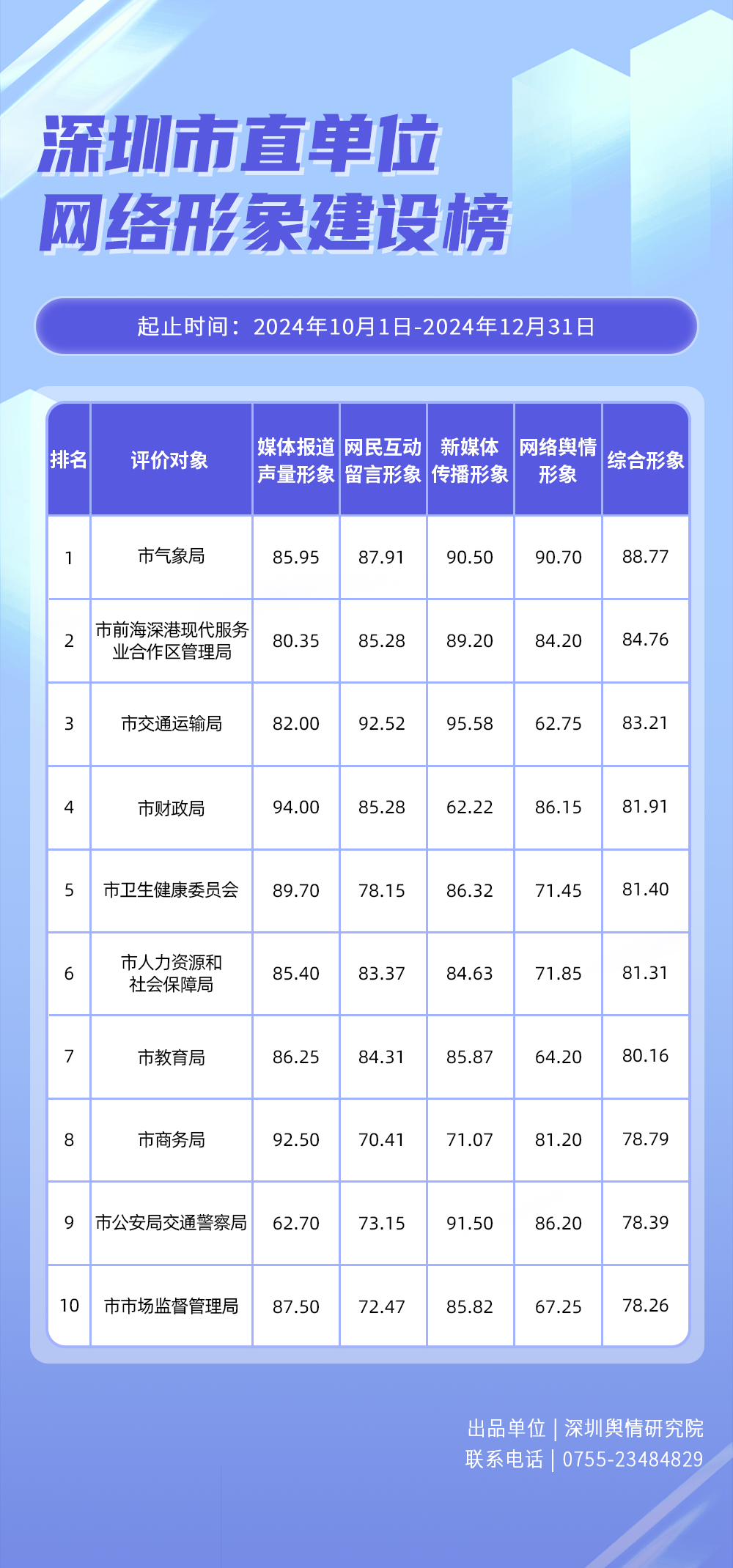 1.《深圳市直單位網(wǎng)絡形象建設榜》從深圳市直單位的媒體報道聲量形象(100分)、網(wǎng)民互動留言形象(100分)、新媒體傳播形象(100分)、網(wǎng)絡輿情形象(100分)四個維度展開綜合評價、計分排名,最終形成榜單。