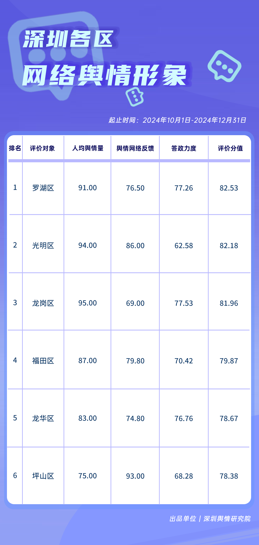 網(wǎng)絡輿情方面,羅湖區(qū)、光明區(qū)、龍崗區(qū)得分在80分以上,登上《深圳各區(qū)網(wǎng)絡輿情形象榜》前三名,福田區(qū)、龍華區(qū)、坪山區(qū)以超過75分的綜合評價分值上榜,體現(xiàn)出各區(qū)在維護良好網(wǎng)絡輿情生態(tài)、快速響應網(wǎng)民關切等方面的積極態(tài)度。